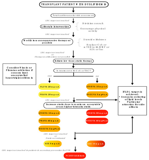 First, lifestyle modifications should be encouraged, because drug-induced dyslipidemia is amplified by a sedentary lifestyle with high intake of saturated fat, reduced physical activity and obesity, also related to the stimulation of appetite induced by cortisones. The Mediterranean diet has been shown to reduce total cholesterol and LDL levels by about 10% in renal transplant recipients, and a statistically significant reduction in triglycerides in patients with lower LDL levels [112].
