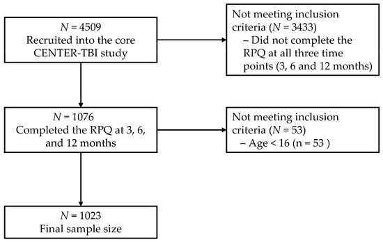 Data were retrieved from the CENTER-TBI database using the data access tool NEUROBOT, and the 3.0 core sample comprised 4509 participants. For the present study, we focused on individuals who had completed the RPQ assessments at three, six and twelve months after TBI. Due to the study design, individuals seen in the ER and then discharged were not involved in the twelve-month assessments. The present study included participants aged 16 and above, limited to those who filled out the RPQ at all three time points, yielding a final sample of 1023 participants. For more details, see Figure 1.