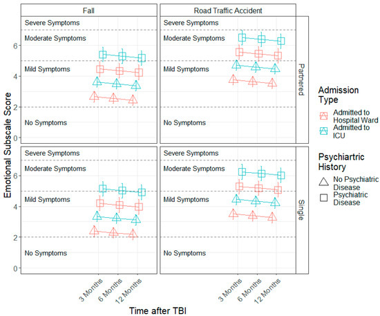 Finally, a significant effect of time since TBI (b = −1.03, SE = 0.31, p = 0.001) was determined with respect to the RPQ total score, showing that symptom severity levels decrease linearly from 3 to 12 months. Moreover, sex (b = −4.60, SE = 2.20, p = 0.038), admission type (b = 3.50, SE = 1.07, p = 0.001), injury cause (b = −3.07, SE = 0.85, p < 0.001), prior concussions (b = 2.42, SE = 1.23, p = 0.049) and psychiatric problems (b = 6.02, SE = 1.25, p < 0.001) effects were found. Females, patients who were admitted to the ICU, those who sustained a TBI caused by road traffic accidents or violence/other causes, patients with prior concussions and patients with prior psychiatric problems presented higher RPQ symptom severity compared to males, patients admitted to a hospital ward, those with falls as the injury cause, patients without a prior concussion and patients without prior psychiatric problems (see Figure 5).