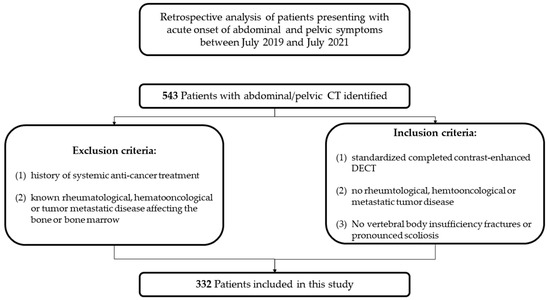 Inclusion criteria were: (1) a standardized completed contrast-enhanced DECT exam, (2) no known rheumatological, hematooncological or metastatic tumor disease, (3) no vertebral body insufficiency fractures, and (4) no pronounced scoliosis. Exclusion criteria were: (1) a history of systemic anti-cancer treatment and (2) any hematooncological [16], metastatic tumor [17] or rheumatological [18] disease known to affect the bone or bone marrow (see Figure 1).