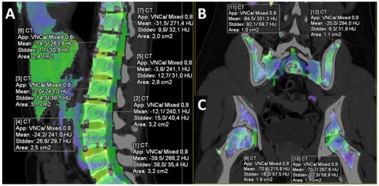 Software-generated VNCa images were displayed as color-coded maps of the bone marrow. It was possible to adjust the degree of overlay between the color map and the CT image. A circular ROI tool was used to measure the mean absolute VNCa attenuation in eleven ROIs that were placed at the following sagittal sites in the vertebral bodies of the lower thoracic spine (T 11–12), upper lumbar spine (L 1–3) and lower lumbar spine (L 4–5), as well as in coronal plan for right and left dorsal iliac crests, and both femoral bones (see Figure 2A–C).