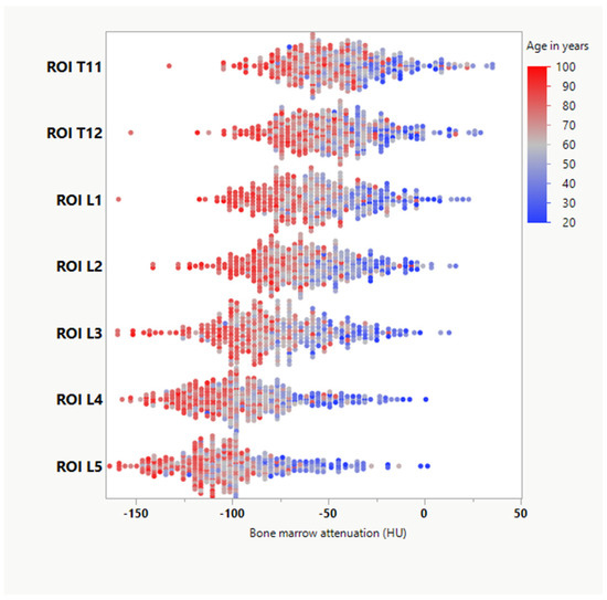 Scatter plot showing variations in bone marrow attenuation (BMA) depending on age and the vertebral body. ROI = region-of-interest. T11-L5 indicates the vertebral body of measurement.