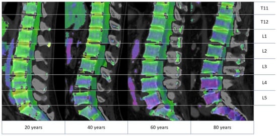 Bone marrow attenuation assessment of four different 20-, 40-, 60-, and 80-year-old male patients. The bone marrow attenuation is color-coded, with yellow and green colored areas representing higher and blue and violet colored areas lower bone marrow attenuation. The comparison demonstrates an overall age-associated decreasing bone marrow attenuation, which is disproportionately more pronounced in the lower spine. T11-L5 indicates the vertebral body level.