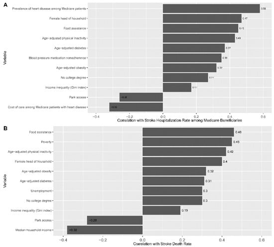Correlation of continuous variables with outcome variables. (A) Correlation of continuous variables with stroke hospitalization rate (SHR) per 1000 Medicare beneficiaries, 65+, all races/ethnicities, both genders; (B) correlation of continuous variables with stroke death rate (SDR) per 100,000, all ages, all races/ethnicities, both genders.