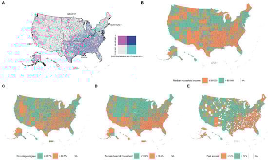 High SHR and SDR were mostly seen in the South census region followed by the eastern part of the Midwest region (Figure 2A). Socioeconomic determinants which were significant in the multivariate models, such as income, education, female head of household, and even park access, show a similar pattern to the stroke outcomes (Figure 2B–E). A map of US counties showing the pattern of the other significant predictors is given in Figure S2 in the Supplementary Materials.