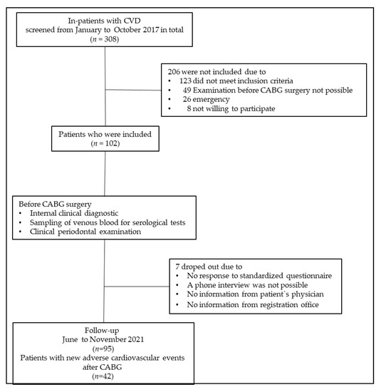 The present work was a substudy of a trial entitled “Oral microbiome as a predictor for new cardiovascular events in patients with coronary heart disease”. The study is registered in the “German Register for Clinical Studies (DRKS) ID: DRKS00015776. We conducted a longitudinal cohort analysis with a follow-up period of 3 years. Out of a population of 308 patients with CVD for whom CABG surgery was indicated, 102 were ultimately enrolled at the Department of Cardiac Surgery of the Mid-German Heart Center at the University Hospital Halle (Saale) between January and October 2017. An experienced cardiac surgeon (B.H.) as well as two clinically calibrated dentists (L.F. and J.G.) diagnosed all patients regarding cardiological and periodontal conditions and assessed all patients for study eligibility. The following inclusion criteria had to be met: Caucasian descent, age ≥ 18 years, at least 60% stenosis of one of the main coronary arteries demonstrated by angiography, and the presence of at least four teeth. Exclusion criteria were inability to give written informed consent, subgingival scaling and root planing and/or antibiotic therapy during the last 6 months prior to the examination, pregnancy, and the need of antibiotic prophylaxis against endocarditis according to the criteria of the European Society for Cardiology [22]. Moreover, patients with diseases or disorders such as current drug or alcohol abuse that preclude participation in this clinical study according to investigator judgment were excluded. In all, 206 patients were not included in the study because they did not meet the inclusion criteria, a dental examination was not possible before the CABG surgery, a cardiac emergency existed, or the patients did not consent to participate in the study. After an observation period of over 3 years (mean 148 + 8.3 weeks), data on the postoperative cardiovascular outcome of 95 patients (drop out: 9.3%) could be generated. The study flow is shown in Figure 1.