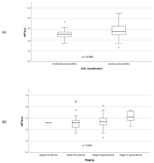 According to the CDC classification, sAF was significantly (p = 0.006) increased in patients with severe periodontitis (2.8 a.u.) in comparison to individuals with moderate periodontitis (2.6 a.u.) (Figure 2a). If the relationship between sAF and the periodontitis staging according to the new classification was examined, a clear but not significant (p = 0.060) trend for a positive association between both parameters could be shown (Figure 2b).