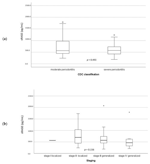 Level of soluble receptor of advanced glycation end products (sRAGEs) related to periodontitis severity according to CDC (a) and new classification (b). o, outlier; *, extreme value.