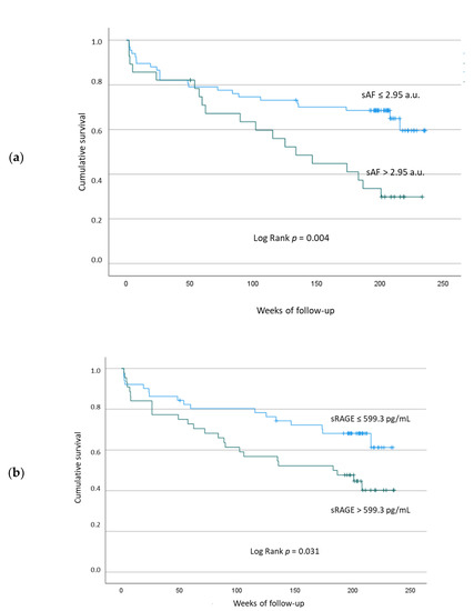 Statistical analyses were carried out using a commercial software (SPSS v.25.0 package, IBM, Chicago, IL, USA). Values of p < 0.05 were considered as significant. Categorical variables were documented as number and the corresponding percentage in brackets. For comparisons, the chi-squared test was employed. If the expected values in one group were <5, Fisher’s exact test was performed. Metric demographic, clinical, and serological data were checked for normal distribution using the Kolmogorov–Smirnov test and the Shapiro–Wilk test. As none of the metric values were normally distributed, they were plotted as median and 25th/75th percentiles. For statistical evaluation, the Mann–Whitney U test was used. Correlations between two variables were calculated using the Spearman correlation test. For multivariate cross-sectional analyses, binary logistic regression was applied. Univariate survival analyses were carried out with Kaplan–Meier curves and Log-Rank test. Cox regression was applied in order to generate adjusted HRs. A receiver-operating characteristic (ROC) analysis including determining the Youden-index was carried out in order to measure the optimal threshold values for sAF and sRAGE to distinguish patients with and without a cardiovascular endpoint after CABG surgery.