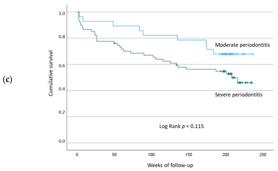 For severe periodontitis, we demonstrated that the HR for new events (HR = 1.8, p = 0.115, Figure 4c) tended to increase after CABG. Compared to the 1-year follow-up result [7], the HR was only slightly increased (HR = 1.6, p = 0.448). Nevertheless, we could not prove that periodontitis is a risk factor for patients who need CABG. So far, only a few studies have investigated a putative association between periodontitis and recurrent cardiovascular events. One study on 106 stroke/transient ischemic attack patients revealed that severe periodontitis was associated with an adjusted risk (HR = 2.8, p = 0.02) for new adverse events such as TIA, myocardial infarction, and vascular death [45]. A second study including 884 survivors of MI demonstrated only among never-smokers that mean CAL was associated with recurrent fatal and nonfatal cardiovascular events (HR 1.4 pro 1 mm CAL) after an average follow-up of 2.9 years [46]. A third study investigated 165 consecutive subjects with acute coronary syndrome (ACS) and 159 medically healthy, matched control subjects regarding periodontal conditions. After an observation period of 3 years, a positive association between alveolar bone loss caused by periodontitis and future ACS events was shown [47]. To our knowledge, there is still no study identifying periodontitis as a risk factor for recurrent cardiovascular events after CABG. Before any further conclusions can be drawn, however, a larger study is necessary.