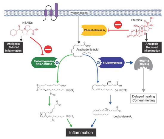 Inflammation can be caused by two main pathways: the cyclooxygenase (COX) pathway and the lipoxygenase pathway (Figure 1) [12]. Most NSAIDs block COX activity, meaning that the inflammation present is therefore driven by lipoxygenase, which can upregulate matrix metalloproteinase-9 (MMP-9) activity. Elevated MMP-9 levels may, in return, lead to corneal melting. Ideally, the surgeon would simultaneously administer NSAIDs and a topical lipoxygenase inhibitor to ensure that both arms of the inflammatory cascade are blocked. However, topical lipoxygenase inhibitors are not available to date. Steroids, however, inhibit phospholipase A2 [13], located upstream of lipoxygenase in the inflammatory pathway (Figure 1), and there are several topical ophthalmic steroid drugs to choose from. From a mechanistic perspective, the concomitant use of steroids with NSAIDs therefore blocks both COX and lipoxygenase, inhibiting both arms of the inflammatory pathway, which should stop melting from occurring and help explain the favorable results seen in our study.