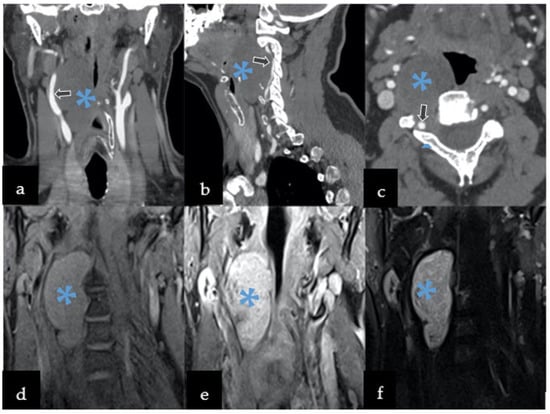 Preoperative imaging included both computed tomography angiography (CTA) and magnetic resonance imaging (MRI). CTA revealed hypodense well-defined mass with calcification displacing the vessels in the following planes: (a) coronal, (b) sagittal, and (c) axial. MRI was characterized by: (d) by low T1 signal, with (e) T1 contrast enhancement, and (f) heterogeneously hyperintense T2 signal. Legend: arrows—compression and displacement of the right carotid artery, *—lesion.