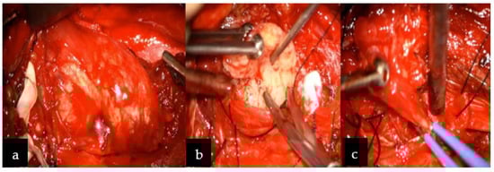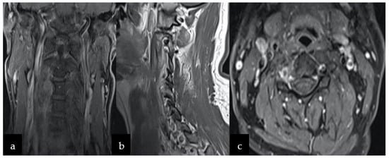 Based on its localization, and neuroradiological and clinical features, the tumor was preliminarily diagnosed as a slow-growing lesion, such as peripheral nerve sheath tumor (PNST), more likely than meningioma (description Figure 1). Therefore, schwannoma diagnosis was more convincing than neurofibroma or malignant peripheral nerve sheath tumor (MPNST) due to homogenous enhancement on MRI without any infiltration to nearby structures and bone remodeling rather than destruction. The patient was qualified to surgery without prior preoperative biopsy, since performing biopsy in PNST carries risks of neurological deficit post-operatively, damaging adjusting vascular structures with consequent death [7,8]. Surgery was performed through an anterior transcervical approach procedure with a longitudinal incision from C2 to C6, along with the sternomastoid (Figure 2a–c). The cervical neurovascular bundle and vertebral artery were identified and dissected. Then, local structures were mobilized and pulled to the sides, exposing the tumor. Intraoperatively, a firm and well-encapsulated mass was seen along C2 to C4 under the microscope, which was carefully evacuated in fragments using an ultrasonic surgical aspirator. The lesion was fully dissected from the nerve roots and surrounding tissues, then removed. The patient’s postoperative course was uneventful, with discharge from the hospital after four days.