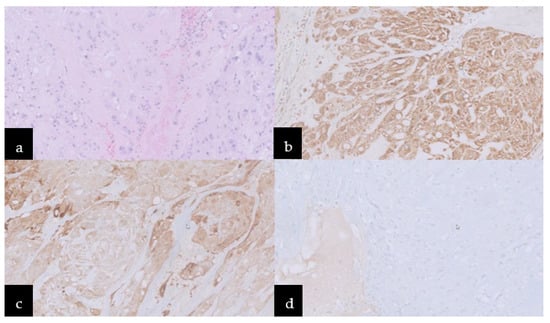 Microscopic images: (a) Hematoxylin–eosin stain, neoplastic cells with pale eosinophilic, cytoplasm vacuolated, arranged in cords separated by fibrovascular bands and myxoid matrix. Immunoreactivity for (b) AE1/AE3, (c) S100, and (d) negative one for GFAP.