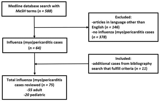 Two authors (M.R. and D.J.) independently and blindly identified and selected titles, abstracts, and full texts in the database search. Discrepancies in the selected articles were resolved by the third author (I.D.). Additionally, the reference list of selected articles and recent influenza myocarditis review articles [1,14,15,17,18] were searched to identify any additional cases for inclusion in accordance with previously established selection criteria (i.e., cases that had pericardial involvement in addition to myocarditis). The flow chart of detailed article selection and the final cases included in the analysis is illustrated in Figure 1.