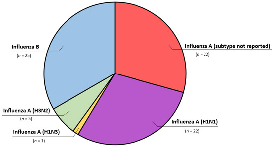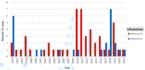 All patients tested positive for acute influenza infection, either by nasopharyngeal swab (n = 50, 66.7%) or by serology testing (n = 25, 33.3%), with the notable predominance of serology testing used in older publications (before the year 2000). Influenza type (A to B, 2:1) did not correlate with worse outcome (p > 0.05), however, 9 out of 11 deceased patients had been diagnosed with influenza A. There was a notably higher incidence of reported cases during and after the 2009 influenza A (H1N1) pandemic (30% of all cases) (Figure 2). Other notable subtypes in our review were H3N2 identified in five cases and H1N3 in one case (Figure 3). Elevated cardiac enzymes (either troponin or in older cases creatine-kinase isoenzyme MB) were reported in 44 cases (58.7%) without the relation to survival (p > 0.05).