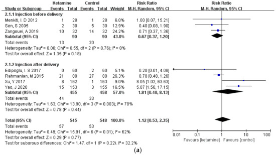 Considering that different durations of ketamine administration may be one of the important factors affecting the outcome indicators, we conducted a subgroup analysis of the included studies, which were divided into two subgroups: pre-delivery administration and post-delivery administration. However, the results of the three outcome measures did not change, and there was still no significant difference between the ketamine and control groups (Figure 6a–c).