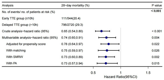 Early group had a significantly lower 28-day mortality (20.4% vs. 29.3%, p < 0.001, Figure 2). The risks of death within 28 days in the early and delayed group were visualized by K-M curve and compared, which supported this result. (Supplementary Figure S2). (HR = 0.65, 95%CI 0.54–0.80, p < 0.001, Figure 2). After adjusted for all covariates, multivariate regression analysis demonstrated a significant beneficial effect of early TTE in terms of the 28-day mortality and the adjusted hazard ratio was 0.74 (95%CI 0.60–0.91, p = 0.004, Figure 2). Furthermore, the association still remained stable in multivariate analysis using PSM adjusted for propensity score, PA, SMRW. The HRs were 0.73–0.78, all p < 0.05 (Figure 2). The E-value was 1.77.