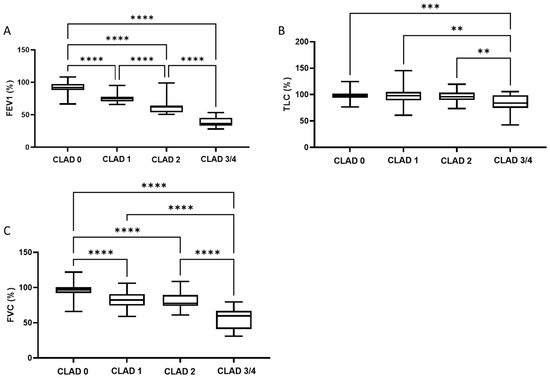 Boxplots showing the relationship between FEV1 (A), TLC (B), and FVC (C), and the CLAD stadium. ** = p < 0.01; *** = p < 0.001; **** = p < 0.0001. Abbreviations: CLAD = Chronic Lung Allograft Dysfunction; FEV1 = Forced Expiratory Volume in 1s; FVC = Forced Vital Capacity; TLC = Total Lung Capacity.