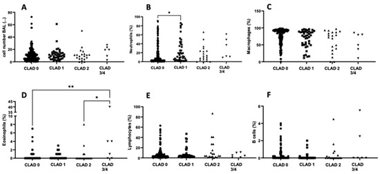 Cellular distribution of BAL fluid among the different CLAD stages. Scatterplots showing the cellular distribution of the analyzed BAL fluid for each CLAD stadium: cell number (A), proportion of neutrophils (B), macrophages (C), eosinophils (D), lymphocytes (E), and B cells (F). * = p < 0.05; ** = p < 0.01. Abbreviations: BAL = Bronchoalveolar Lavage; CLAD = Chronic Lung Allograft Dysfunction.
