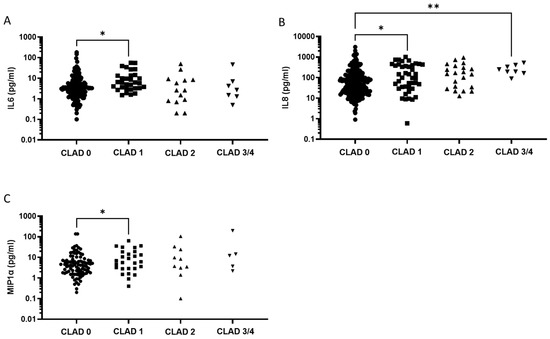 Cytokine concentration in BAL fluid. Scatterplots showing BAL cytokine concentrations for each CLAD stadium: IL6 (A), IL8 (B), and MIP1⍺ (C). * = p < 0.05; ** = p < 0.01. Abbreviations: CLAD = Chronic Lung Allograft Dysfunction; IL6 = Interleukin 6; IL8 = Interleukin 8; MIP1⍺ = Macrophage Inflammatory Protein-1.