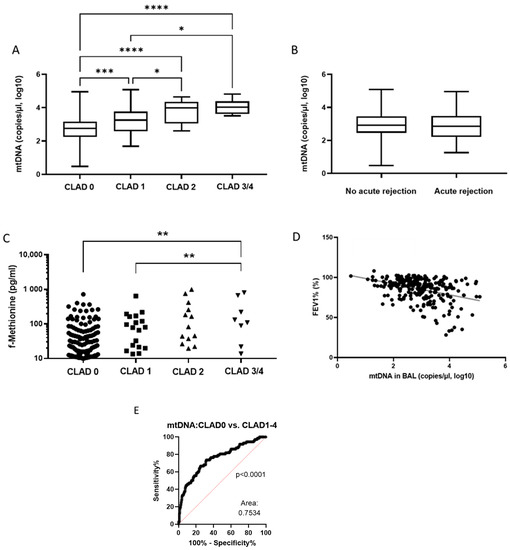 Diagrams showing the relationship between concentrations of ND1-mtDNA (A) and f-Met (C), and CLAD stage. Boxplot comparing ND1-mtDNA concentration with the status of acute rejection (B). Scatterplot showing the correlation between the concentration of ND1-mtDNA and FEV1 (D). A ROC analysis of the predictive power of ND1-mtDNA concentration for CLAD status (E). * = p < 0.05; ** = p < 0.01; *** = p < 0.001; **** = p < 0.0001. Abbreviations: CLAD = Chronic Lung Allograft Dysfunction; FEV1 = Forced Expiratory Volume in 1 second; mtDNA = mitochondrial DNA.