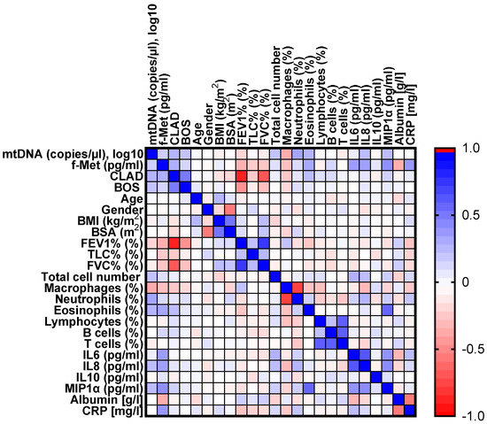 Heatmap of the Pearson correlation matrix. The color depth represents the strength of the correlation between each pair of parameters considered. Blue represents a positive correlation, and red represents a negative correlation. Abbreviations: BMI = Body Mass Index; BOS = Bronchiolitis Obliterans Syndrome; BSA = Body Surface Area; CLAD = Chronic Lung Allograft Dysfunction; C-Reactive protein; FEV1 = Forced Expiratory Volume in 1 second; f-Met = formyl-methionine; FVC = Forced Vital Capacity; IL = Interleukin; MIP1⍺ = Macrophage Inflammatory Protein-1; mtDNA = mitochondrial DNA; TLC = Total Lung Capacity.