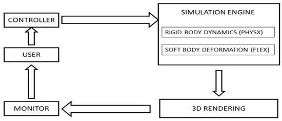 The software design approach selected for this liver simulator uses a combination of existing software modules and new code such as NVIDIA PhysX and NVIDIA Flex. Along with the software design, the management of the physics by the simulator must be considered, that is, how the simulator will handle collisions between the simulated components. Position-based dynamics are considered to be fast and stable and model position displacements directly, although they are not as accurate as the finite element model [21]. Position-based dynamics are used by NVIDIA FleX [12,22]. NVIDIA FleX was employed for soft body deformations and uses a particle-based model for a wide variety of objects.