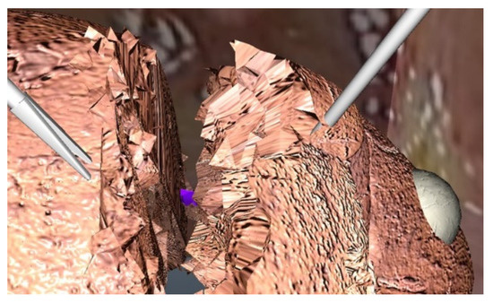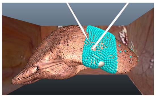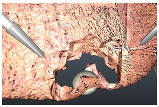 The liver model used was created directly from computed tomography scan data from a patient (Figure 2). A tetrahedral-mesh model of the liver was created using 3D Slicer (www.slicer.org, accessed on 12 August 2019) and Autodesk Maya (San Rafael, CA, USA) [14]. The left hepatic vein is deep in the left medial segment. The left medial segment was modeled with tetrahedra as shown in Figure 2. The right lobe and left lateral segment were static, creating a hybrid model for computing efficiency [15].