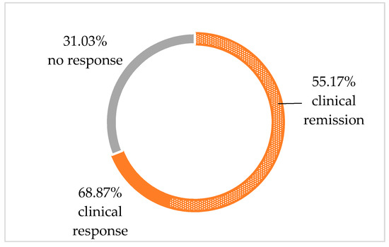 The percentage of patients who achieved clinical remission in the studied population was 55.2%, which was lower compared to previous published reports (75.6%, Levine 2019; 82.1%, Szczubełek 2021). A plausible explanation for the slightly worse efficacy among our patients is that an objective marker of active inflammation, i.e., fecal calprotectin level of ≥250.00 µg/g, was a condition for inclusion in the study. In the above-mentioned two publications, the primary criterion for inclusion in the analysis was the clinical manifestation of the disease, which was assessed based on the disease activity score (PCDAI/CDAI), i.e., partially subjective interpretation of symptoms by the patient. An elevated score on the clinical disease activity scale does not necessarily correlate with objective markers of mucosal inflammation and, thus, not indicate an actual exacerbation of the disease.