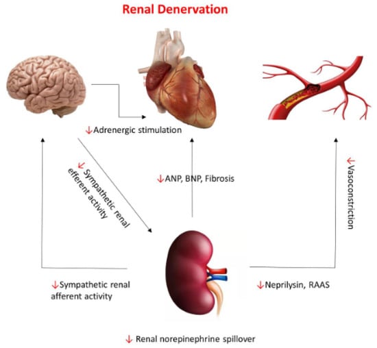 Heart failure remains among the leading causes of morbidity and mortality in the United States, with a continuously increasing prevalence of the disease [1]. Despite the advancements in heart failure therapies, from pharmacotherapies to mechanical support devices and transplant, the morbidity and mortality have remained essentially unchanged [2]. Heart failure is a complex syndrome, characterized by cardiac remodeling under the effect of multiple pathophysiological mechanisms. In chronic cardiovascular diseases, including heart failure, the sympathetic nervous system is constantly being activated. Initially, this activation is compensatory and necessary for the regulation of cardiac output and systemic perfusion. However, chronically, it becomes maladaptive, leading to unfavorable cardiac and vascular remodeling [3,4]. Renal sympathetic activation, and cross-talk with the central nervous system (nucleus tractus solitarius), is one of the regulatory pathways of cardiac parameters, such as heart rate, blood pressure, and cardiac output. The feedback pathway between the kidneys and the CNS is one of the major regulators of central sympathetic outflow. They produce neuro-hormonal modulation via the activation of the renin–angiotensin–aldosterone system (RAAS) in response to hypoperfusion, leading to sodium retention, vasoconstriction, and intravascular volume depletion [5]. A regional norepinephrine (NE) spillover in the kidneys and the heart has been correlated with a worse prognosis compared to systemic norepinephrine levels, which may make renal sympathetic pathways a reasonable therapeutic target [6]. In this review, we evaluate the pathophysiological mechanisms linking sympathetic activation to heart failure pathogenesis, and evaluate the evidence supporting a potential use of renal denervation as a therapeutic option for patients with heart failure, with both reduced and preserved ejection fraction.