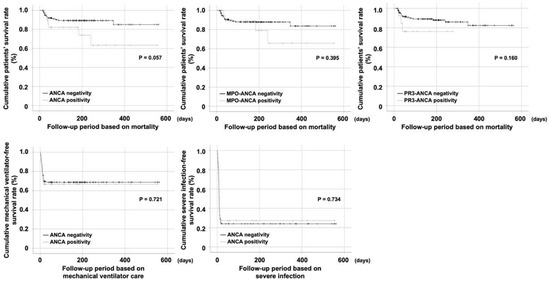 Patients with ANCA positivity exhibited a lower cumulative survival rate than those without. However, the difference between the two was not statistically significant (p = 0.057). Cumulative survival rates of patients according to MPO-ANCA positivity or PR3-ANCA positivity did not differ significantly either. Moreover, ANCA positivity did not affect the cumulative mechanical ventilator-free survival rate or severe infection-free survival rate in patients infected with SARS-CoV-2 (Figure 1). We also compared cumulative survival rates of patients with MPO-ANCA positivity and patients with PR3-ANCA positivity. Although the survival curve showed a trend of early death in patients with PR3-ANCA positivity, their survival rates were not significantly different (Figure S1).