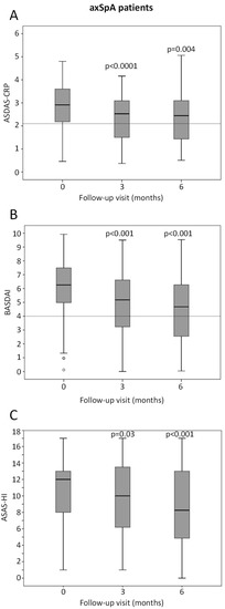 - Lukas, C.; Landewé, R.; Sieper, J.; Dougados, M.; Davis, J.; Braun, J.; van der Linden, S.; van der Heijde, D.; Assessment of SpondyloArthritis international Society. Development of an ASAS-Endorsed Disease Activity Score (ASDAS) in Patients with Ankylosing Spondylitis. Ann. Rheum. Dis. 2009, 68, 18–24. [Google Scholar] [CrossRef] [PubMed]