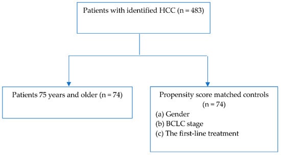 The analyses included 148 patients (84 men, 57%) with HCC. Controls (<75 years) were matched to cases (≥75 years) according to gender, BCLC stage, and the first-line treatment (see Figure 1).