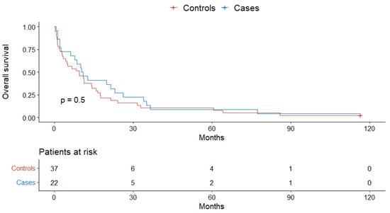 The overall survival in cases was comparable to controls (p = 0.42, Figure 2). The one-, two-, and three-year overall survival was 42% and 31%, 19% and 12%, and 12% and 9% in cases and controls, respectively (p = 0.2, 0.4, 0.8). Similarly, there was no difference in the one- and two-year progression-free survival: 28% and 18% vs. 10% and 7% in cases and controls, respectively (p = 0.2, 1).