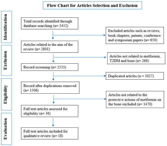 The Preferred Reporting Items for Systematic Reviews and Meta-Analyses (PRISMA) guidelines were referred to while conducting a sizable literature search. This literature search aimed to encapsulate the effects of metformin treatment on bone marrow density and adiposity in animal models. The electronic search incorporated the most recent studies and evidence for this review while reducing the probability of the databases used: Google Scholar, Wiley Online Library, PubMed, ScienceDirect, SCOPUS, and SpringerLink. The results were filtered, and only studies published between 2000 and 2021 were picked, diminishing the prospect of involuntarily omitting older studies. Studies had to have used metformin as part of the intervention, the animal model could not have had comorbidities, and lastly, animal models with the presence of estrogen were excluded, as this influences the bone mineral density. The inclusion criteria of relevant articles revolved around the keywords and terms mentioned individually, including “(metformin AND bone AND type 2 diabetes mellitus AND animal) OR (adiposity)”, replacing bone. The full-text articles accumulated were then imported to EndNote X9.2 as a repository, where the search results obtained were exported as EndNote files. Subsequently, using the Covidence software allowed the co-authors to aid in filtering the gathered manuscripts and possible duplications, while the remaining results were screened based on their title, abstract, and relevance to this review to reduce publication bias.