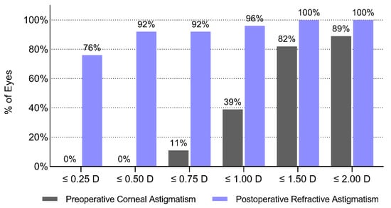- Day, A.C.; Dhariwal, M.; Keith, M.S.; Ender, F.; Vives, C.P.; Miglio, C.; Zou, L.; Anderson, D.F. Distribution of preoperative and postoperative astigmatism in a large population of patients undergoing cataract surgery in the UK. Br. J. Ophthalmol. 2019, 103, 993–1000. [Google Scholar] [CrossRef] [PubMed] [Green Version]