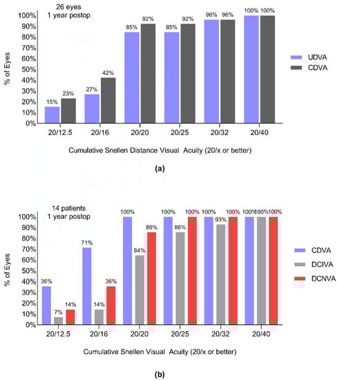 (a) Cumulative histogram of monocular uncorrected and corrected distance visual acuity. (b) Cumulative histogram of binocular distance-corrected visual acuities at multiple distances measured 1 year postoperatively.