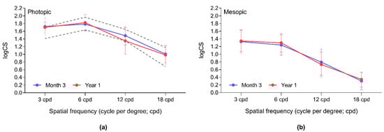 Photopic (a) and mesopic (b) contrast sensitivity is stable during the first postoperative year. Results are within the age-defined population normal values for the older age group (50–75 years of age) [17]. logCS: logarithm of Contrast Sensitivity; cpd: Cycle per degree.