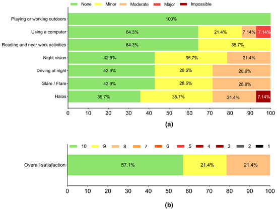 The majority of patients had no, or only mild, difficulties performing their usual daily activities (Figure 7a), and all of them were highly satisfied with their vision (mean rating of 9.14 ± 1.23 on a scale from 1 to 10, where 10 represents the highest level of satisfaction; Figure 7b).