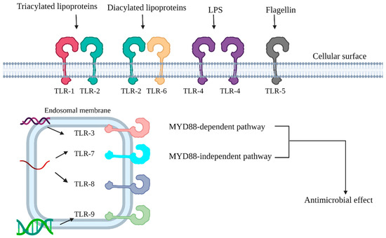 Each Toll-like receptor has its own function. The TLR1/2 complex recognizes the triacylated lipoprotein commonly found in Gram-negative bacteria, and the TLR2/6 complex recognizes the diacylated lipoprotein synthesized by Gram-positive bacteria [35,36,37]. LPS serves as a specific ligand for TLR4, and flagellin can bind to TLR5 [38]. With regard to TLRs located on the endosomal membrane, TLR3 recognizes dsDNA [39], and both TLR7 and TLR8 can recognize ssRNA [40]. TLR9 can bind to CpG-containing DNA [41]. Activated TLRs then trigger a downstream cascade and contribute to antimicrobial effects.