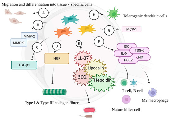 (A) MSCs can migrate to a site of inflammation and differentiate into tissue-specific cells for repair. (B) MSCs inhibit the expression of MMP-2 and MMP-9, attenuating scar formation. (C) Inhibition of TGF-β1 signaling reduces fibrogenesis. (D) MSC-derived HGF reduces type I and type III collagen fibers, which contribute to scarring. (E) Antimicrobial molecules including LL-37, lipocalin, BD2, and hepcidin secreted by MSCs can inhibit bacterial growth. (F) IDO, TSG6, IL-6, PGE2, and NO can exert immunomodulation, inhibiting proliferation of T cell, B cells, and natural killer cells and inducing M2 macrophage differentiation. (G) MCP-1, which induces immune-cell infiltration, is inhibited by MSCs. (H) Tolerogenic dendritic cells are enhanced by MSCs.