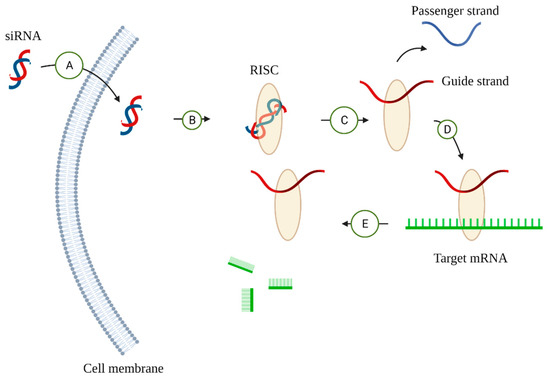 The regulatory mechanism of siRNA on gene expression. (A) siRNAs pass the cell membrane. (B) siRNAs then load into the RNA-induced silencing complex (RISC), which is part of a family of ribonucleoprotein complexes and is able to locate target mRNAs [111]. (C) RISC selects a strand with a less thermodynamically stable 5’ end and degrades the other strand, known as a passenger strand [112,113,114]. (D) The RISC–siRNA complex binds to the target mRNA. (E) The target mRNA is degraded.