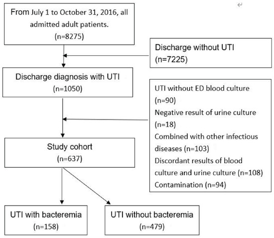 - Microbiological criteria: The microbiological results of the urine culture performed in the ED were positive. A positive result was defined as an organism grown in a quantitative urine culture with a concentration of >105 colony-forming units/mL [11].