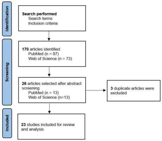 The initial database search generated 170 results. Three articles were excluded as duplicates, and after screening the titles and abstracts of the remaining, we included 23 articles for this review (Figure 1 and Table 1).