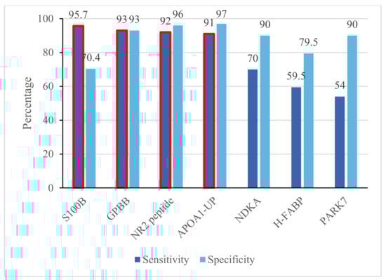 As it can be seen from Figure 2, some of these biomarkers (e.g., S100B) have better sensitivity than others, but are less specific for stroke []. In addition, some comorbidities and other factors are also found to interfere with the accuracy of these biomarkers. However, when the biomarkers are combined in a panel, they may offer greater sensitivity and specificity values compared to individual biomarkers [].