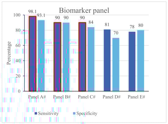 Unavailability of single biomarkers with both high sensitivity and specificity has been a limiting factor in adopting blood biomarkers as stand-alone diagnostic tools in clinical situations such as stroke. To add to the complexity, patterns of biomarkers changes may differ depending on the type of stroke (e.g., IS versus ICH) or depending on the affected brain areas []. It has been suggested that by combining several biomarkers into a biomarker panel more useful information can be obtained particularly by including biomarkers specific to different areas of the brain [,,,]. In this review, we have identified five biomarker panels that have shown both a sensitivity and specificity above 50% (Figure 3). We have named these five biomarker panels as panels A through E in this review due to the lack of specific trade names for them in the original articles (Table 2 and Table 3).