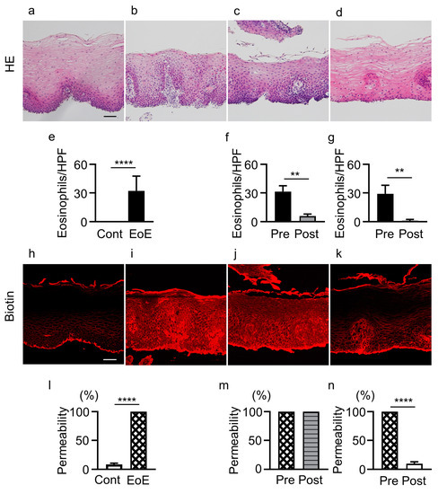 Infiltration of eosinophils and epithelial permeability in controls and EoE patients before and after treatment. (a–d) HE staining of biopsy sections. (e–g) Eosinophil counts in: controls (cont, n = 11) and EoE (n = 11, (e)), EoE before treatment (pre, n = 5) and after treatment (post, n = 5) among patients with unchanged permeability (f), and EoE before treatment (pre, n = 5) and after treatment (post, n = 5) among patients with decreased permeability (g). (h–k) Sections stained with biotin (red). (l) Percentage of biotinylation of controls (n = 11) and EoE before treatment (n = 11). (m,n) Esophageal epithelial permeability of EoE patients with unchanged permeability (n = 5, (m)) and decreased permeability (n = 5, (n)) after treatment. Representative HE and biotin staining of samples from controls (a,h), EoE patients before treatment (b,i), EoE patients with unchanged permeability after treatment (c,j), and EoE patients with decreased permeability after treatment (d,k). Data are expressed as mean ± standard deviation. EoE, eosinophilic esophagitis; HE, hematoxylin and eosin; HPF, high-power field. ** p < 0.01, **** p < 0.0001. Bar = 50 μm.