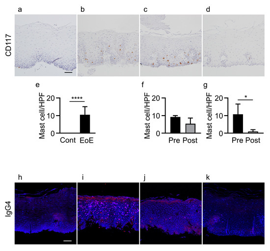 Infiltration of mast cells and IgG4 deposits in controls and EoE patients before and after treatment. (a–d) CD117 staining of esophageal biopsy sections. (e–g) Mast cell counts in: controls (cont, n = 11) and EoE (n = 11, (e)), EoE before treatment (pre, n = 5) and after treatment (post, n = 5) among patients with unchanged permeability (f), and EoE before treatment (pre, n = 5) and after treatment (post, n = 5) among patients with decreased permeability (g). (h–k) IgG4 immunofluorescence (red) and nuclear staining with DAPI (blue) in biopsy sections. Representative immunohistochemical and immunofluorescence staining of controls (a,h), EoE patients before treatment (b,i), EoE patients after treatment with unchanged permeability (c,j), and EoE patients after treatment with decreased permeability (d,k). Data are expressed as mean ± standard deviation. DAPI, 4′,6-diamidino-2-phenylindole; EoE, eosinophilic esophagitis; HPF, high-power field; Ig, immunoglobulin. * p < 0.05, **** p < 0.0001. Bar = 50 μm.