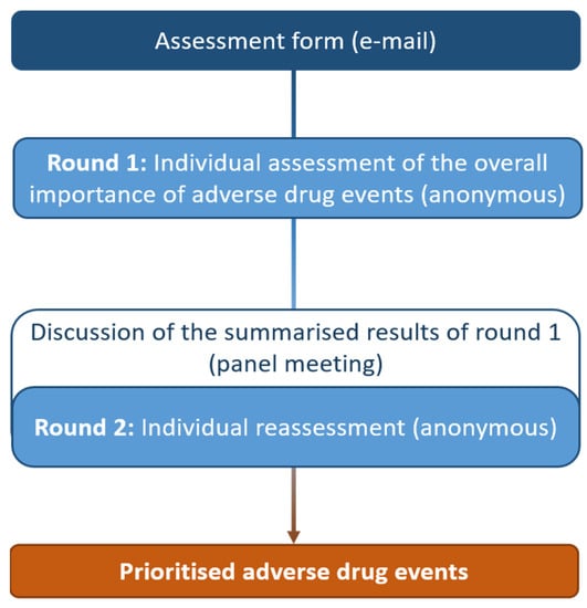 24], in order to prioritise adverse drug events (ADEs) for two clinical settings: (1) at hospital admission (to prioritise ADEs originating in ambulatory care); (2) during hospital stay (to prioritise ADEs originating in the hospital). Similar to the Delphi method, we developed an assessment form with candidate ADEs for each panel based on a literature search. Panellists then independently rated each ADE on two occasions, with the first-round ratings fed back to them before the second-round ratings were placed. In contrast to the Delphi method but consistent with the RAM, a moderated face-to-face meeting (one for each panel) was held in between rounds to enable the exchange of arguments between experts (